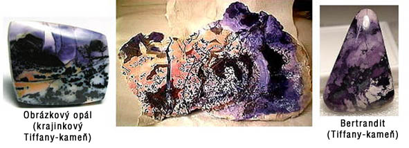 AJ: Bertrandite, Tiffany Stone, zriedkavejšie Purple Opal, Ice Cream Opalite, Fluorite Opal, Picture Opal, Opalized Fluorite, Opalite, NJ: Bertrandit