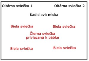 Ak bábku nepoužijeme okamžite, zabalíme ju do bieleho bavlneného alebo ľanového plátna. - Štyri biele sviečky pomažeme odbosorovacím olejom (od stredu k špici a od stredu nadol). Rozložíme ich na oltári podľa nasledovného nákresu: