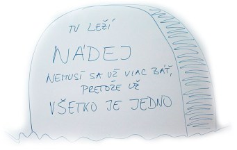 Narážal na niečo, čo už je asi rok stará vec. Čítala som si knihu od Pemy Chödrön a robila som si z nej cvičenia, ktoré som považovala za rozumné. Samozrejme, to boli časy, kedy sme sa ešte s anjelmi hrýzli ako psi… A raz, keď mi urobili zle, tak som si veľkým na tabuľu napísala “Anjeli neexistujú. Gabriel neexistuje. Všetko je to len výplod mojej chorej mysle.” Po pár dňoch, keď moja autohypnóza 🙂 nemala potrebný úspech (no presviedčajte sami seba, že neexistuje niečo, čo je pre vás reálnejšie ako hmota sama!), som pristúpila k najdrastickejšiemu cvičeniu Pemy Chödrön – k vzdaniu sa nádeje. A tak som si vyrobila novú “mnemotechnickú” 🙂 pomôcku: