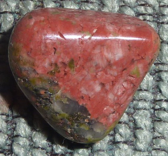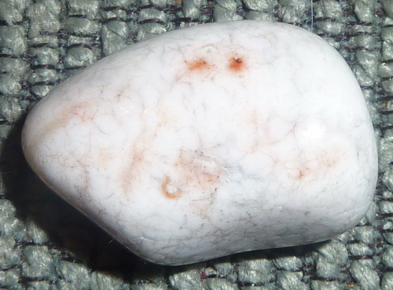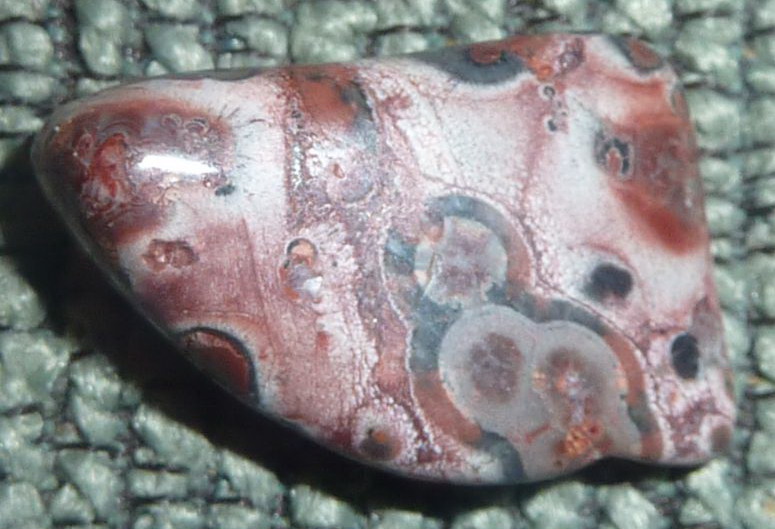 Mirka tipuje na ryolit. S ryolitom je ten problém, že okrem ryolity sa týmto slovom označuje aj jaspis. Ryolit ryolit, ktorý som videla, má skôr vrstvy, nie očká. Toto mi vyzerá na červenkavý jaspis Leopardia kožka. Mám podobný, len nie až tak výrazne okatý. Mohol by to byť aj oceánsky jaspis, ale tá Leopardia kožka sa mi zdá pravdepodobnejšia.