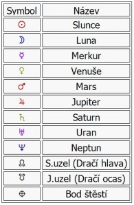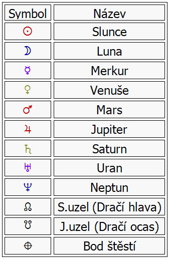 Ak ste sa na svoj radix – grafické znázorenenie vášho horoskopu v hodine vášho narodenia už pozreli, možno vás zaskočili niektoré znaky. Program ich síce vysvetľuje, ale pre úplnosť ich dodávam aj do tohto článku. Takto vyzerajú celosvetovo zaužívané znaky planét: