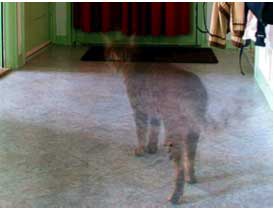 Prejavuje sa to všelijako. Lassiter je mňaukoš. Ale niekedy, keď on mňauká, počujem ešte slabší mňaukot niekde nablízku. Dostala som sa dokonca tak ďaleko, že som si myslela, že to sa hlási Cica, ktorá sa vracia… a vyložila som von najprv mäsko a potom mliečko. Pri mäsku som mala pocit, že sa miska trošku pohla a že niekto z neho odžral; pri mliečku, Cicinej obľúbenej potrave, sa ho nikto ani nedotkol.