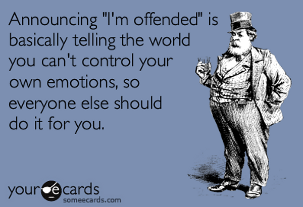 Vyhlasovať “som urazený” je v podstate hovoriť svetu, že nedokážete ovládať svoje vlastné emócie a tak by to mali miesto vás robiť všetci ostatní.