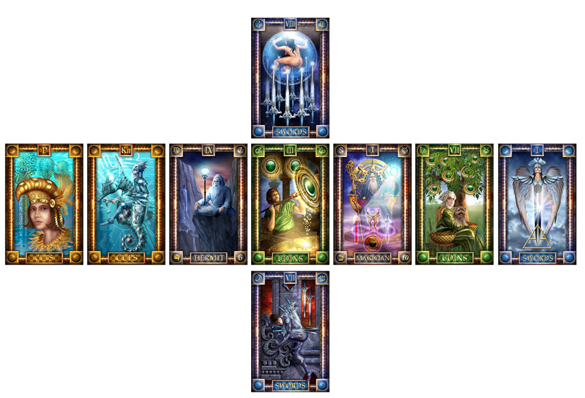 Aj keď tomu Jarah možno neuverí, ale nezabudla som… len som nemala čas skôr urobiť výklad na budúci týždeň a potom už bola taká tma, že som musela obrázok poskladať z kariet, čo mám naťahané do počítača… ale my sme to zvládli a tu je výklad na budúci týždeň (ešte pár minút bude “budúci” a potom už len “tento” 😛 )… Základný rozklad a jeho pozície sú popísané v pôvodnom článku. Tentokrát používam Tarot odf Dreams od Cira Marchettiho a do komentárov nahodím štruktúru, podľa ktorej by ste mohli vykladať. Samotný výklad vyzerá nasledovne: