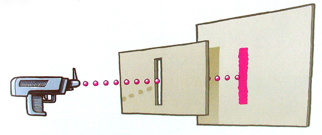 Citát mám z pasáže, ktorá ilustruje experiment s fotónovým delom a platňou s jednou štrbinou a dvoma štrbinami. Keď fotónové delo strieľalo fotóny na jednoštrbinovú platňu, na doske za ňou sa vykreslil obrazec jednej štrbiny.