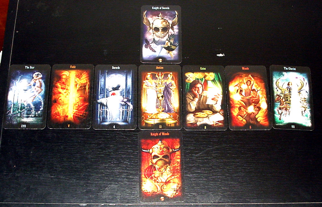 1. no podľa tých dvoch úvodných kariet/nechce sa mi teraz pozerať do knížky a opisať ich význami/to vyzerá na riadnu melu,až bitku!možno o čas,možno su tam prachy,tá hviezda kňaz sú síce priam nabádajúce k vytvoreniu magickej atmosféry,slúžiacej k čomukoľvek,ale je dosť energie?tá štvorka mečová to iba potvrdzuje,že je treba nájsť priestor k regenerácii síl,konečne spravodlivé ,predsa len dostatok času,veď toto nadaie je už toľko krát neoddiskutovateľné,k zmeraniu sily,možno niečo významné,náuky,možno fyzička.napokon sa úkáže,kto je skúsenejším bojovníkom,kto to vie potiehnúť.