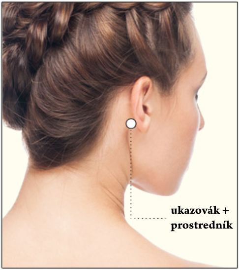 Umiestniť prsty za uši a vyhmatať smerom nadol miesto, kde je priehlbina pri hornom konci čeľuste. Ukazovákom a prostredníkom pevne zatlačiť z oboch strán hlavy v tomto bode, zavrieť oči a pomaly zakláňať hlavy, až kým bolesť v šiji neustane.