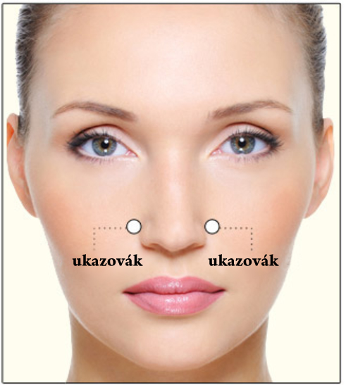 Oba ukazováky položiť na body vedľa nosa. Jemne zatlačiť do zhybu, kde sa nos spája s lícami, tesne vedľa nozdier. Držať do 3 minút stlačené.