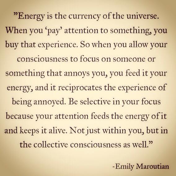 Energia je mena Univerza. Kupuješ si istý zážitok tým, že niečomu “platíš” svojou pozornosťou. Takže ak dovolíš svojmu vedomiu, aby sa sústredilo na niekoho alebo niečo, čo ťa rozčuľuje, odovzdávaš tomu svoju energiu a tá ti vracia zážitok rozčuľovania sa. Vyberaj si, na čo sa sústredíš, pretože tvoja pozornosť tomu dodáva energiu a udržiava to pri živote – a to nielen v tvojom príbehu, ale aj vo vedomí celku.