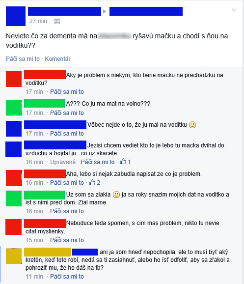 Fejsbúk ma upozornil na novú správu v jednej skupine: “Neviete, čo za dementa má na xxx ryšavú mačku a chodí s ňou na vodítku?” Skoro mi oči vypadli… To aký posudzovačný musí byť niekto, kto napíše, že iný je idiot len preto, že má mačku na vodítku?!