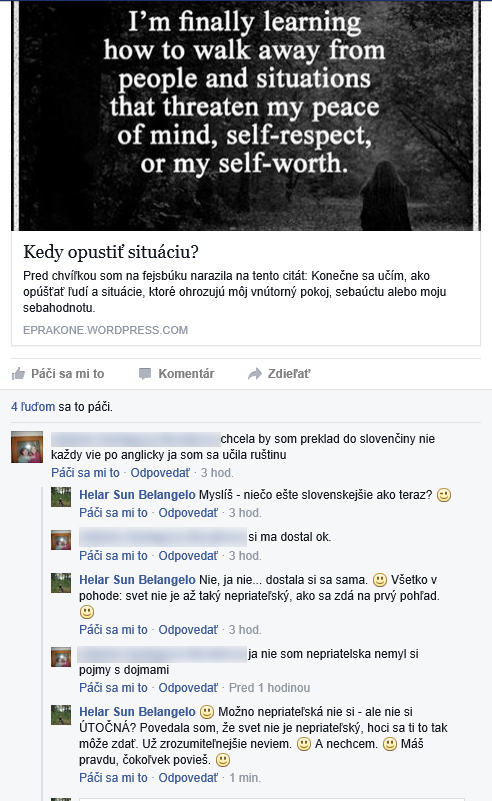 OK, späť k téme: Postla som tam článok, kde sprievodný obrázok je v angličtine, ale článok v slovenčine. Nato sa jedna kočka ozvala, že ale nie každý vie po anglicky a mohlo by to byť v slovenčine… Už vtedy som veľmi úzkostlivo formulovala, pretože mi bolo jasné, že neporiadne/zbrklo pozerá a je v pozícii ukrivdenej Obete.