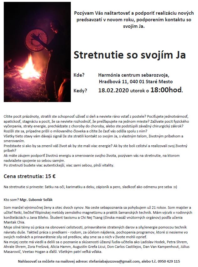 Dnes som dostala pozvánku na aktivitu od Ľubka Soľáka, ktorý mne osobne veľmi sadol (myslím, že som uňho bola na biorgonómii, ale s mojou senilitou to už dnes asi nezistím 😉 ). Je plánovaná na 18. februára večer a pretože my Ľubka môžeme, tak mu to tu zverejníme 😛 :
