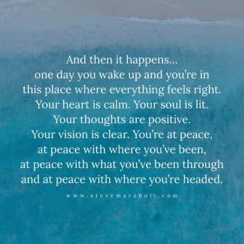 “A potom sa to stane… Jedného dňa sa zobudíš a si na tom mieste, kde sa všetko cíti úplne senzačne. Tvoje srdce je pokojné. Tvoja duša žiari. Tvoje myšlienky sú pozitívne. Tvoj zrak je jasný. Si v mieri – v mieri s tým, kde si bol, v mieri s tým, čím si si prešiel a v mieri s tým, kam smeruješ.”