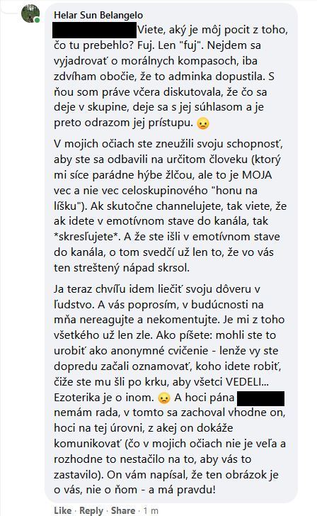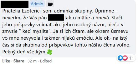 Takže ona neverí (a to úprimne), že nám vadí človek, ktorý nám vadí… Nuž, asi je jasnozrivá alebo čo. Pripomína mi to niekdajšie vyjadrenie jedného ezo-psychológa, kedy napísal, že on vidí, že poznám odpoveď, ale odmietam si to pripustiť. A tak ako vtedy ten psychológ, aj adminka týmto u mňa hasne, pretože potom bez ostychu povie, že používa skupinu a jej členov na svoje obveselenie.