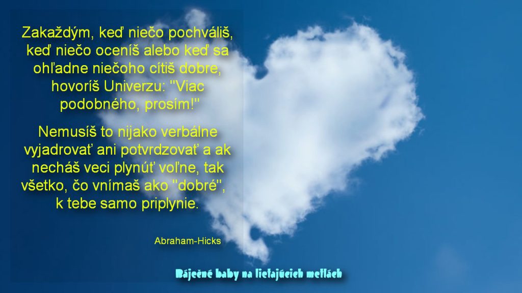 Zakaždým, keď niečo pochváliš, keď niečo oceníš alebo keď sa ohľadne niečoho cítiš dobre, hovoríš Univerzu: “Viac podobného, prosím! Viac podobného, prosím!”
