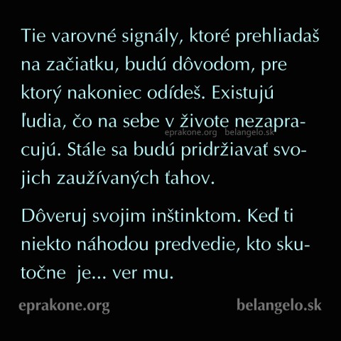 Moje skúsenosti ukazujú, že keď sa ozve intuícia, málokedy býva chybná. A niekedy trvá aj roky, než si to priznáme. Ale možno si tak veľmi niečo prajeme, že sme ochotní zatvárať oči pred varovnými signálmi a až spätne nám dôjde, že tu nejaké varovné signály boli od samého začiatku…