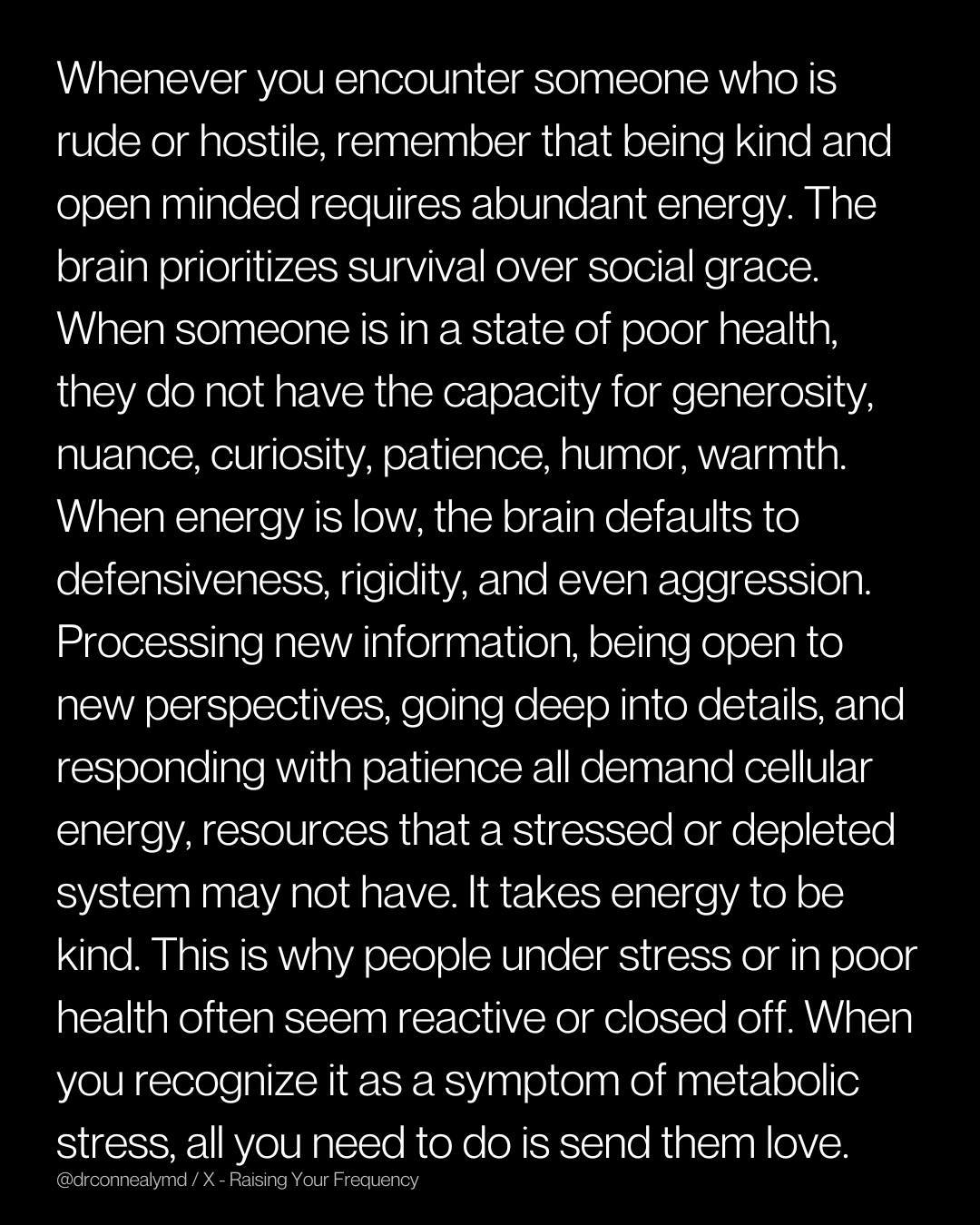 Keď má niekto problémy so zdravím, nemá kapacitu byť ohľaduplný, vnímať jemné odtienky, byť zvedavý, trpezlivý, mať zmysel pre humor či ľudské teplo. Keď je energia nízka, spadá mozog do sebaobrany a nepružnosti, dokonca až do agresívnosti.