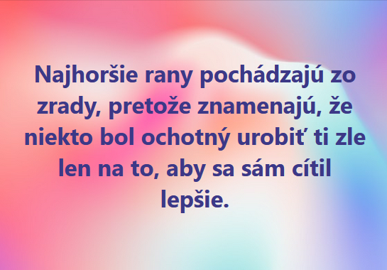 Ak vás citát dojal k slzám, skúste sa pozrieť na opačnú stránku tohto poznania – ako biedne sa asi musel cítiť človek, čo vás zradil? Ak vás podrazil, aby ste nemohli vyniknúť – aký bezvýznamný si musel prichodiť on sám? Ak vás podviedol – aký slabý si musel prichodiť, že nesiahol po ľudskejšej ceste naplnenia si vlastnej potreby?