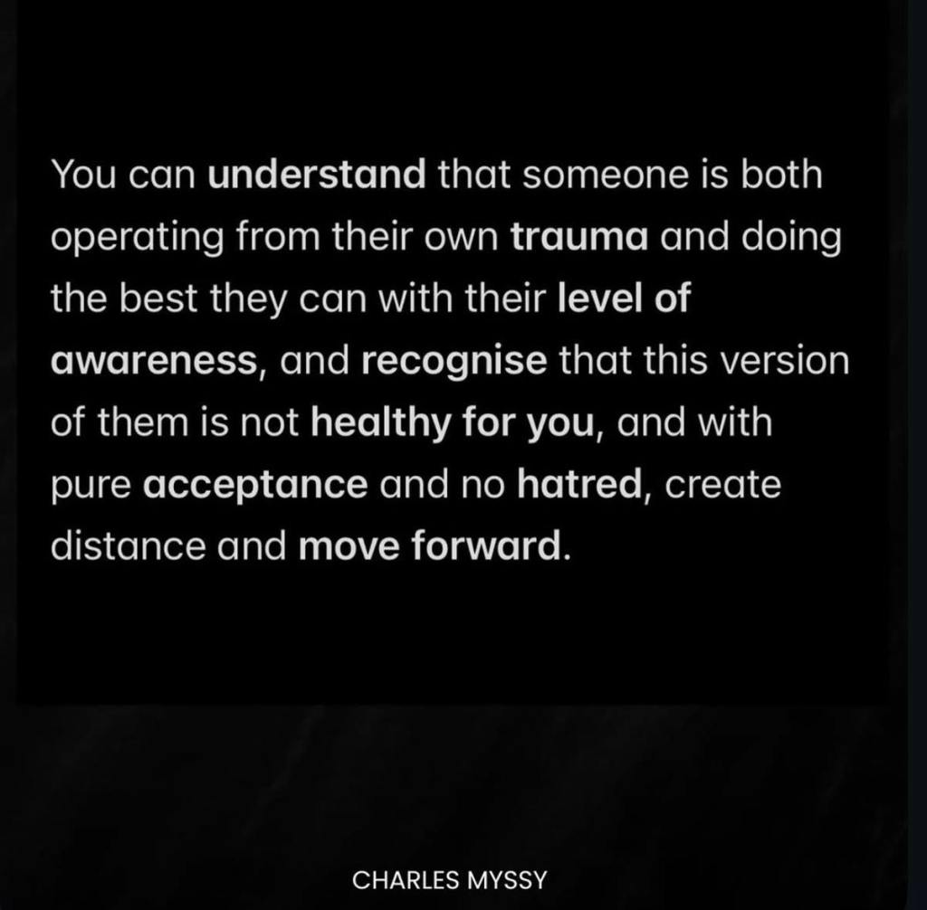 “Môžeš chápať, že niekto koná a reaguje zo svojej traumy a súčasne robí to najlepšie, čo len dokáže, z jeho vlastnej úrovne vedomia. Môžeš porozumieť, že táto verzia z nich nie je pre teba zdravá a vhodná a s plnou akceptáciou a celkom bez nenávisti sa ich môžeš zrieknuť a pohnúť sa ďalej.”