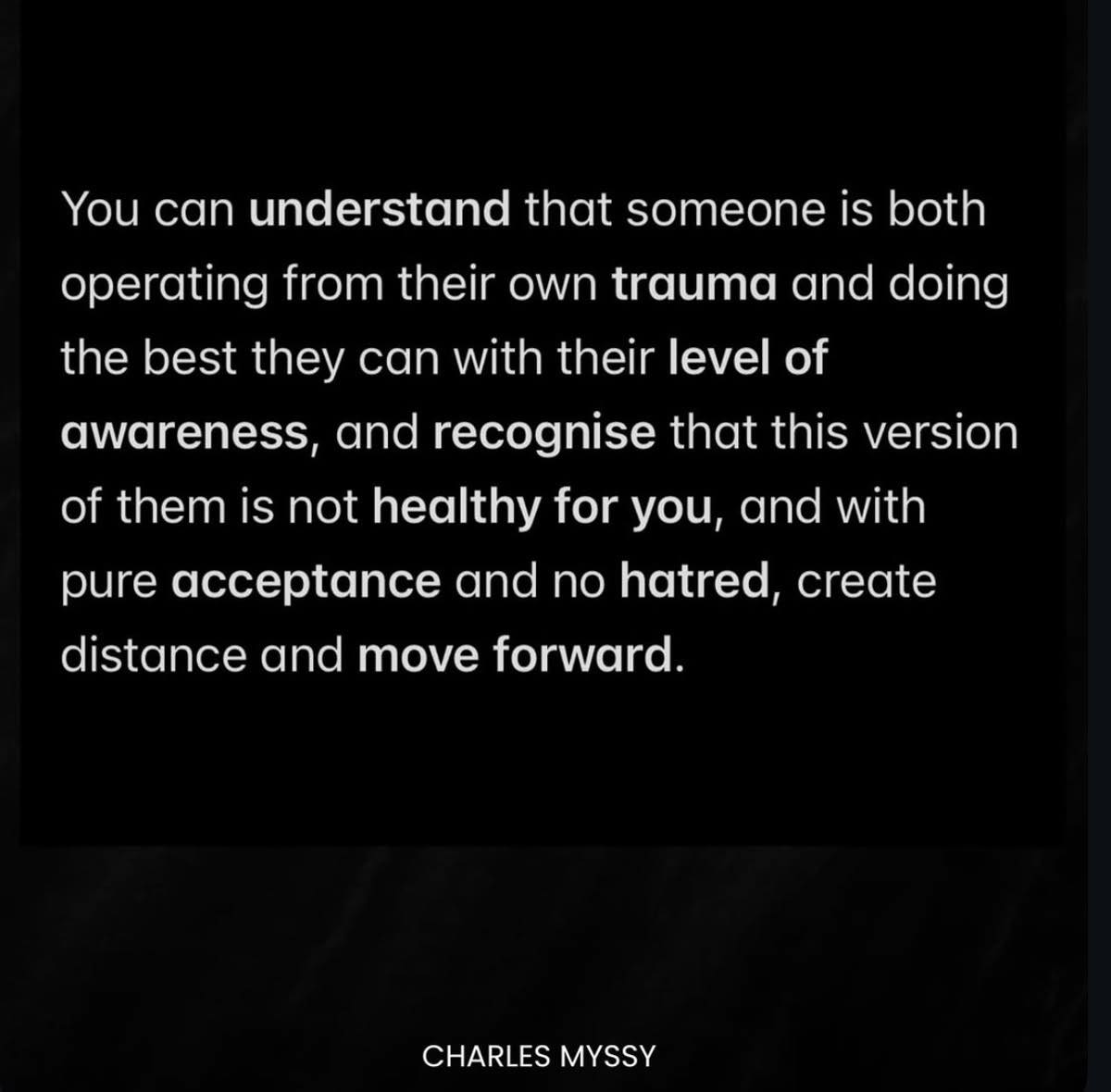“Môžeš chápať, že niekto koná a reaguje zo svojej traumy a súčasne robí to najlepšie, čo len dokáže, z jeho vlastnej úrovne vedomia. Môžeš porozumieť, že táto verzia z nich nie je pre teba zdravá a vhodná a s plnou akceptáciou a celkom bez nenávisti sa ich môžeš zrieknuť a pohnúť sa ďalej.”