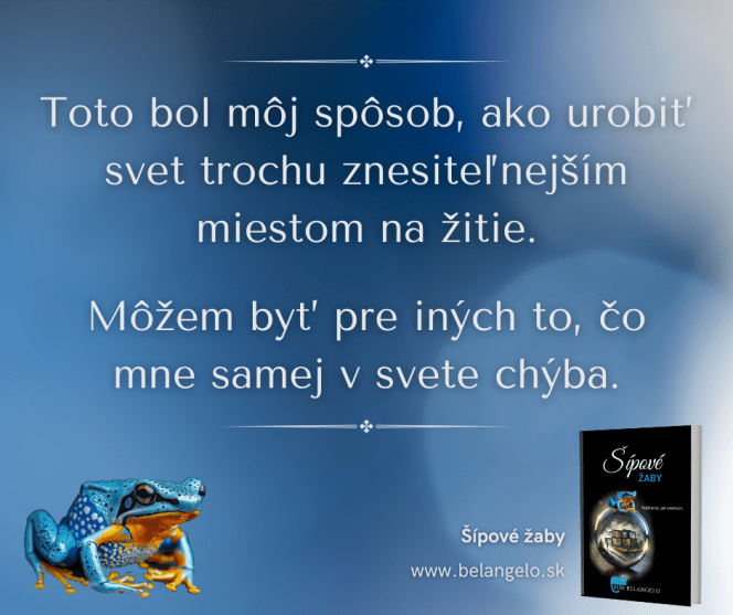 Keď som začala písať Šípové žaby, vyrobila som si obálku, ktorá mi vystihovala myšlienku deja. Nebola som s ňou celkom spokojná; niečo mi chýbalo, ale bola podľa mojej pôvodnej idey “šípová žaba na prameni dobrého”.