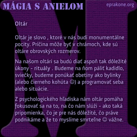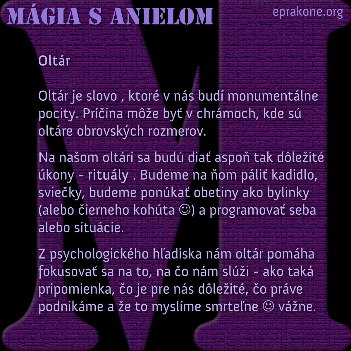 Oltár je náš silový priestor, ktorý má našim činom požehnať a zaistiť úspech a ochranu. Avšak jeho veľkosť záleží od nášho vkusu a možností.