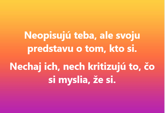 Ak kritizujeme sami seba, nemáme veľa pochopenia ani pre druhých – a tak k sebe priťahujeme ľudí, ktorí tiež radi kritizujú druhých. Akceptujme sa bez kritiky – máme nárok byť presne to, čo sme, pretože sme si prešli tým, čím sme si prešli. Bodka. A potom tento prístup uplatnime aj na ostatných a začnime sa zbavovať ľudí, čo nás ťahajú nadol, do škaredého sveta neznášanlivosti. 🙂