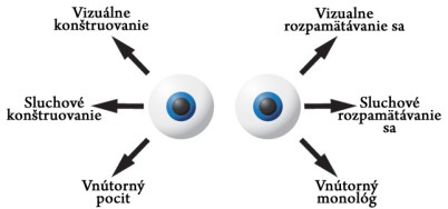 Vľavo je nákres smerovania pohľadu a pohybu očí, prevzatý z neurolingvistického programovania (NLP). Z týchto pohybov sa pri NLP odčítava, v akom type vnútorného programu sme práve ponorení. Dá sa použiť na to, aby sme vedeli povedať, či nám niekto klame alebo nie. NLP-praktici používajú pohyb očí na to, aby zrušili negatívne programovanie.