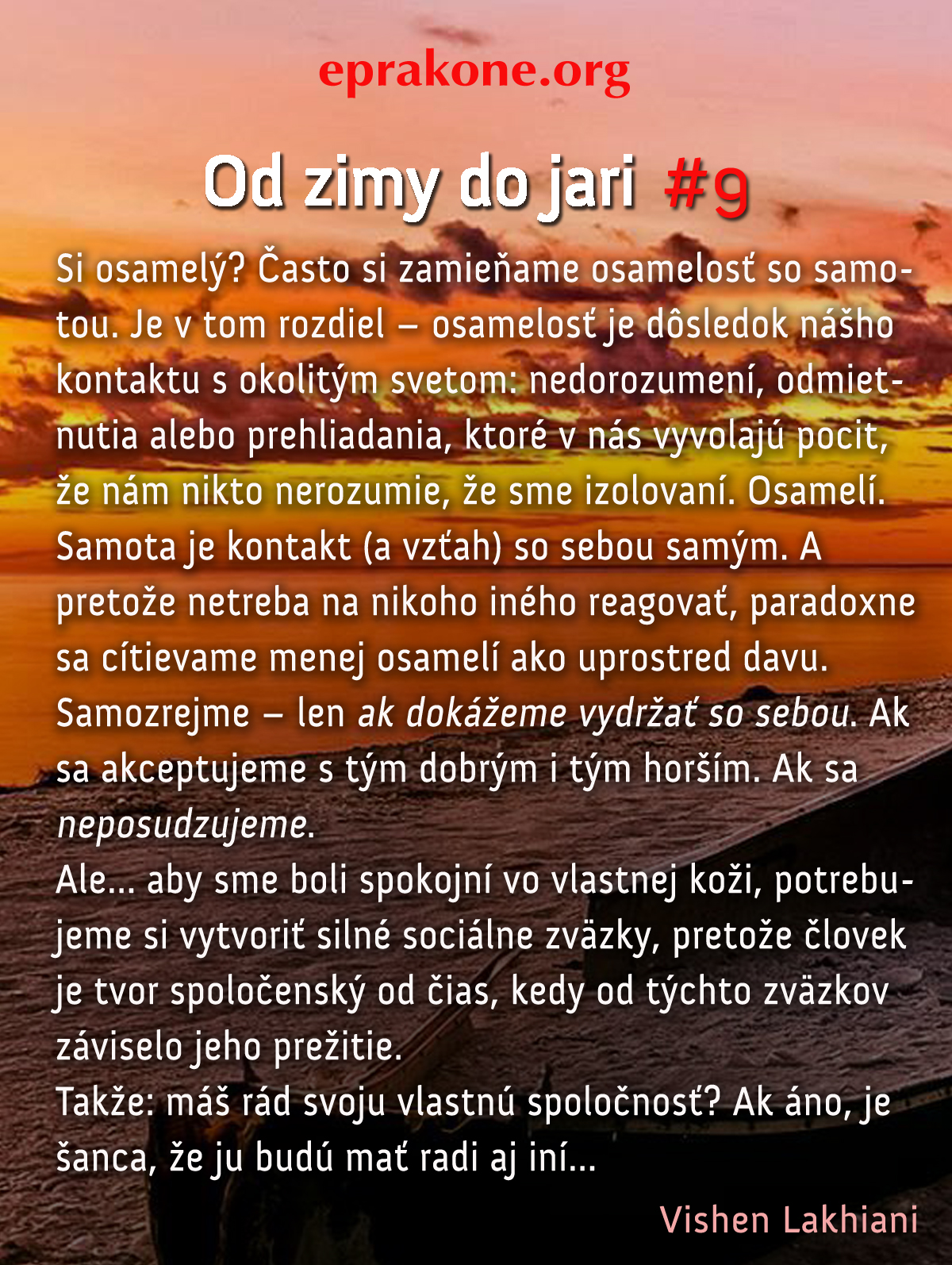 Toto je výťah z článku How Loneliness Is Slowly Killing You od Catherine Winterovej. Priznám sa, názov ma zaujal, ale nakoniec som v ňom nenašla to, čo som hľadala – zdôvodnenie tvrdenia. Dokonca som zistila, že väčšina tých tvrdení na mňa neplatí (napriek tomu, že som etalón samoty a osamelosti)… Ale možno niekomu inému pomôžu: