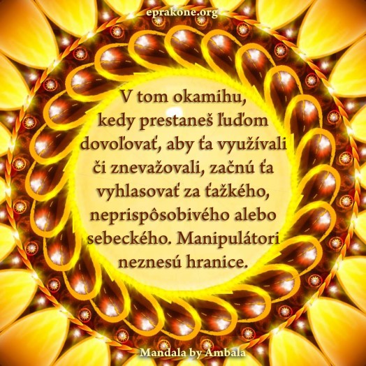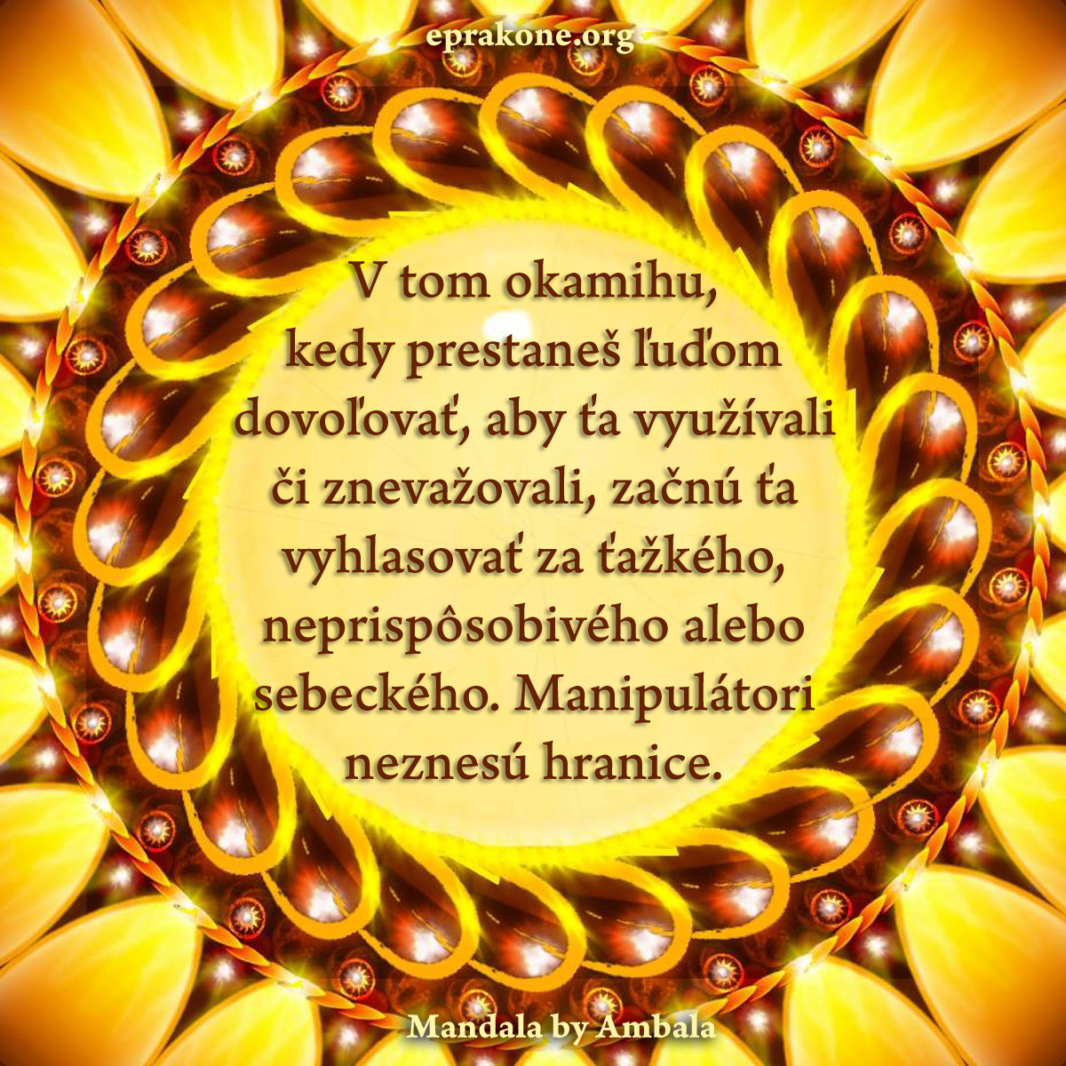 Dnešná mandala by Ambala nám pripomína, že veľmi často sa staneme “neprispôsobivými” a “sebeckými” a “bezohľadnými” vtedy, keď si stanovíme vlastné hranice a nedovolíme iným ľuďom, aby nás manipulovali podľa svojej chuti a záujmu: