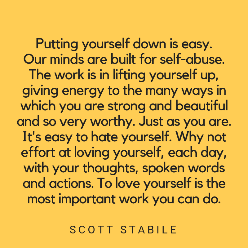 Znevažovať sa je jednoduché. Naša myseľ je stavaná na sebaznevažovanie. Makačka spočíva v tom, že sa povzbudíte a dodáte energiu tým veciam na sebe, kde ste silní a nádherní a cenní. Prečo sa nenamáhať tým, že budete každý deň milovať sami seba – svojimi myšlienkami, slovami a konaním. Milovať sám seba je tá najdôležitejšia vec, ktorú môžete urobiť.