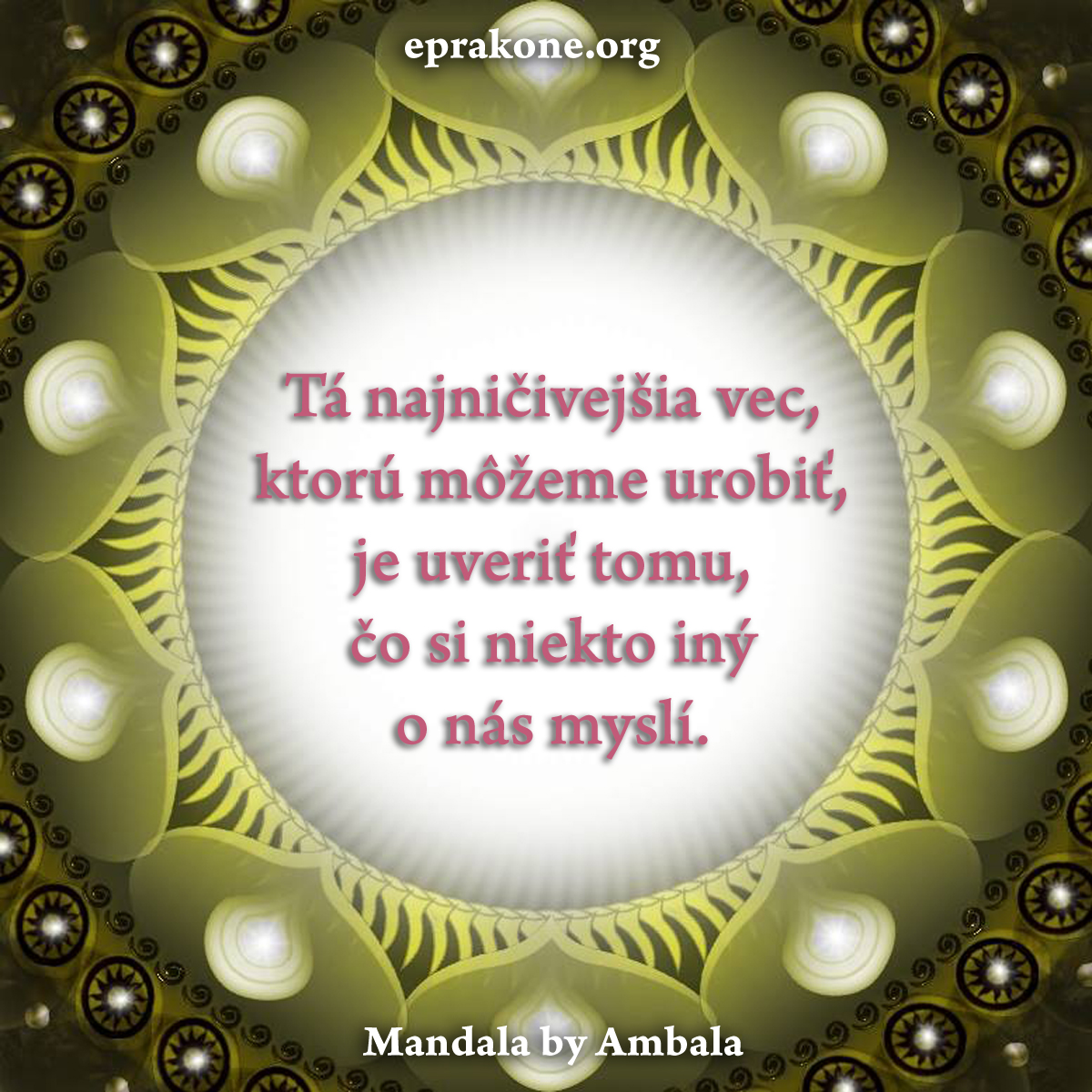 Dnešná mandala by Ambala nám pripomína, že by sme nemali svoj sebaobraz a svoj pocit vlastnej hodnoty stavať na úsudkoch iných ľudí – pretože ani jeden z tých “iných ľudí” nebude žiť ten náš život, ku ktorému sa práve tak kompetentne vyjadruje: